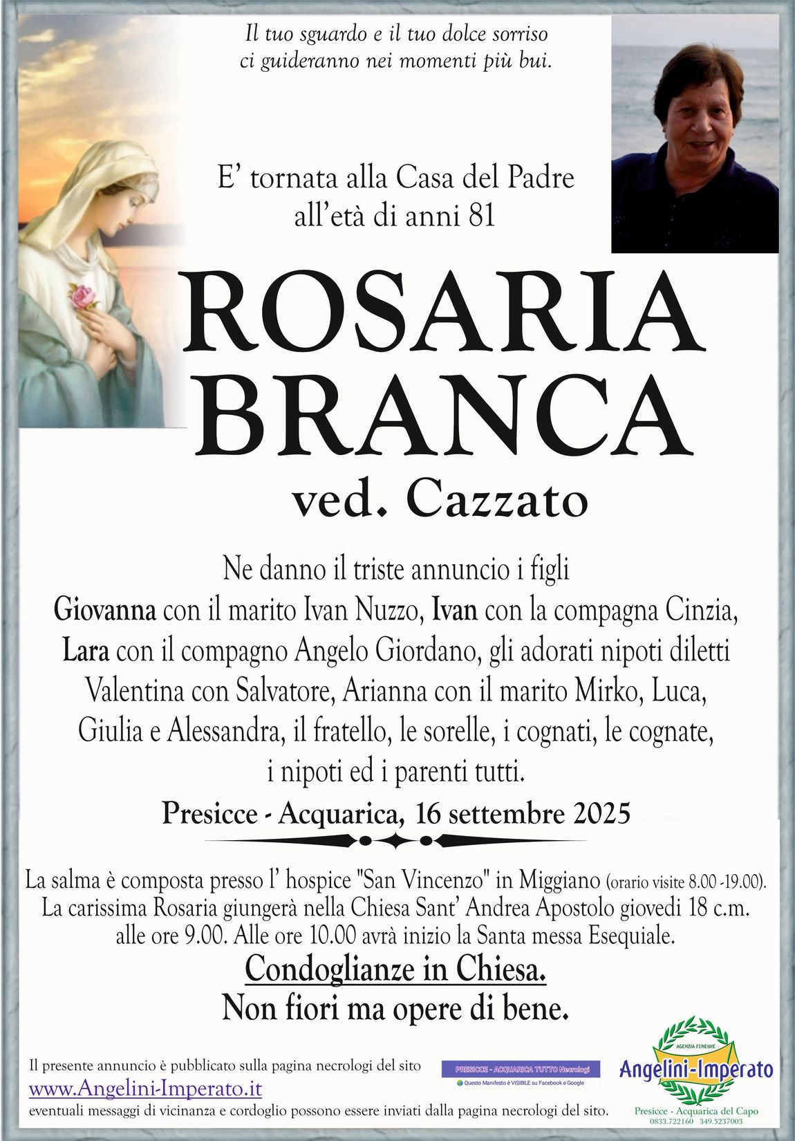 La salma è composta presso l’ hospice "San Vincenzo" in Miggiano (orario visite 8.00 -19.00).