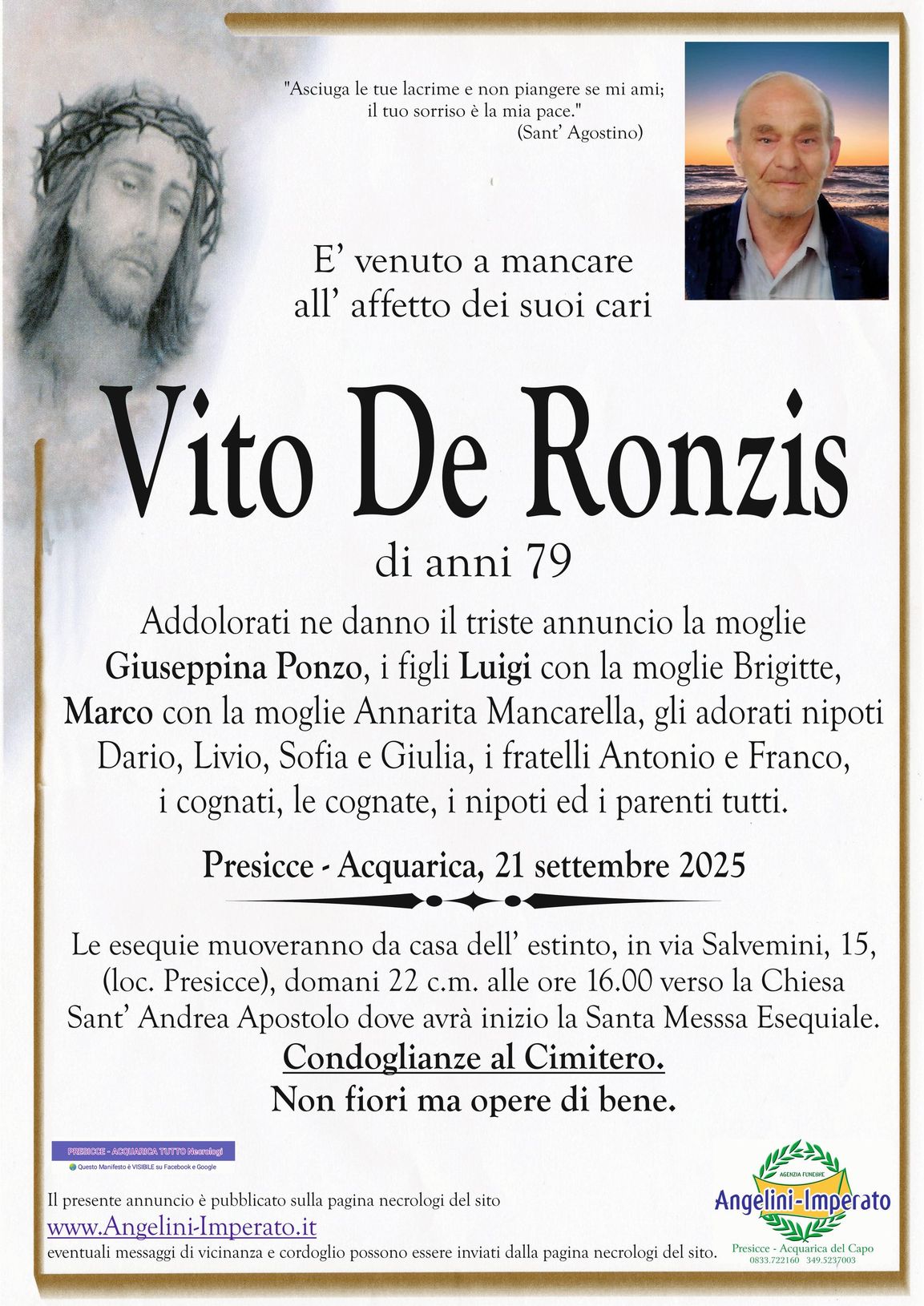 Le esequie muoveranno da casa dell’estinto, in via Gramsci, 119 (loc. Presicce)