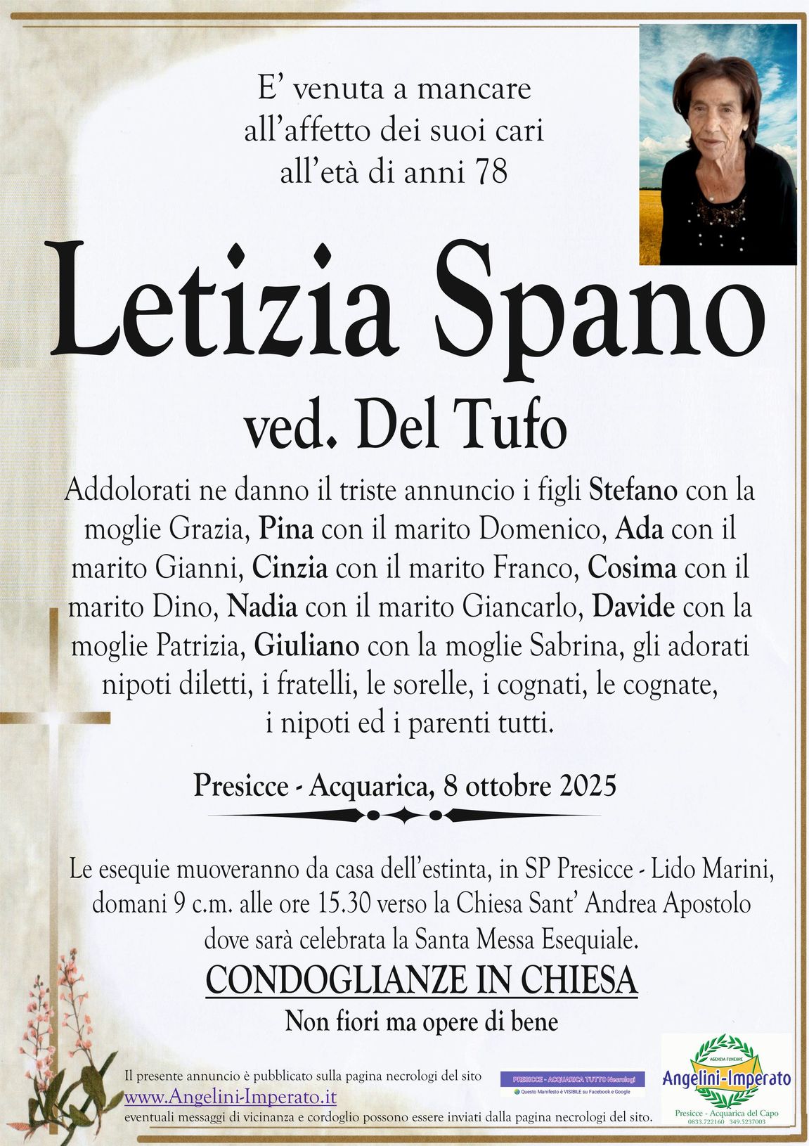 Le esequie muoveranno da casa dell’estinta, in via Stefanelli, 97,